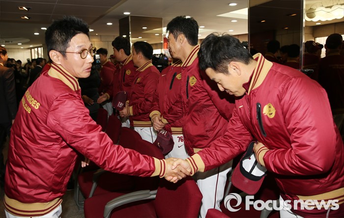 (서울=포커스뉴스) 6일 목동구장에서 열린 프로야구 2016년 넥센 히어로즈 시무식을 마치고 염경엽 감독(왼쪽)이 코칭스탭과 악수하고 있다.