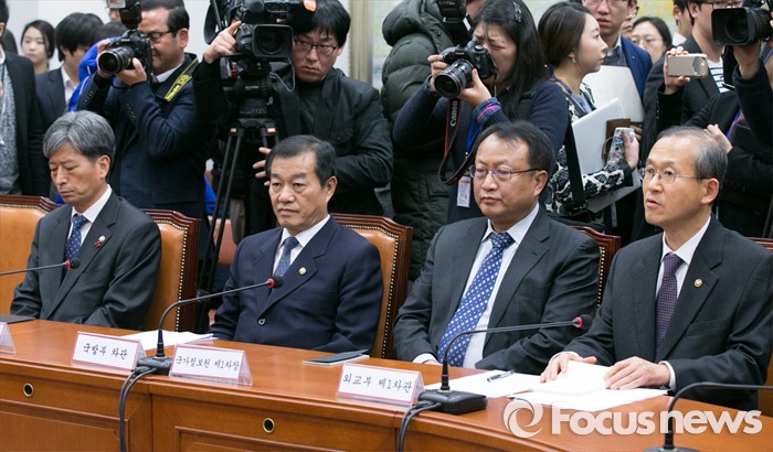 (서울=포커스뉴스) 6일 오후 서울 여의도 국회 새누리당 대표최고위원실에서 열린 북한 핵실험 관련 긴급대책회의에 정부 외교안보 관계부처 차관들이 참석해 있다. 왼쪽부터 황부기 통일부 차관, 황인무 국방부 차관, 한기범 국정원 1차장, 임성남 외교부 1차관.