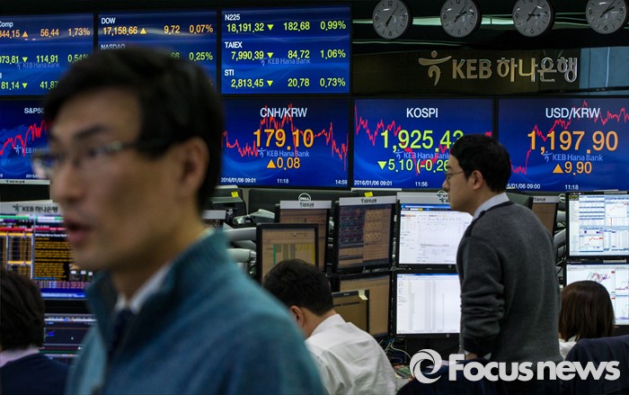 (서울=포커스뉴스) 코스피 지수가 전거래일 보다 5.10포인트(0.26%) 하락한 1,925.43에 거래를 마치며, 북한의 수소탄 실험에도 1920선을 지킨 6일 오후 서울 중구 KEB하나은행 본점 딜링룸에서 딜러들이 업무를 보고 있다. 이날 원달러 환율은 전거래일 보다 9.9원 오른 1197.9원에 마감하며, 지난해 9월 1200.9원 이후 4개월 만에 최고치를 기록 했다.