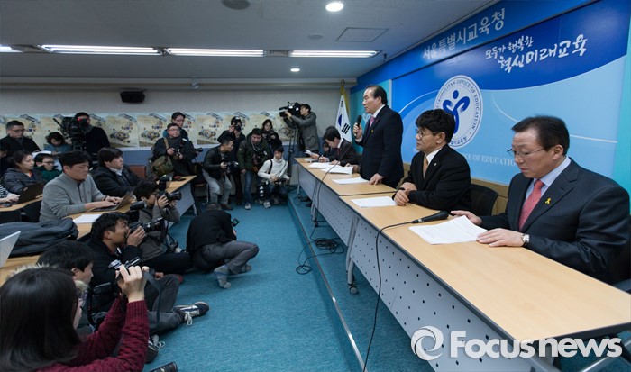 (서울=포커스뉴스) 6일 오후 서울 종로구 서울특별시교육청에서 장휘국 광주시 교육감이 정부의 누리과정 예산 미편성 시 강력 대처 발표와 관련해 긴급 기자회견을 하고 있다.