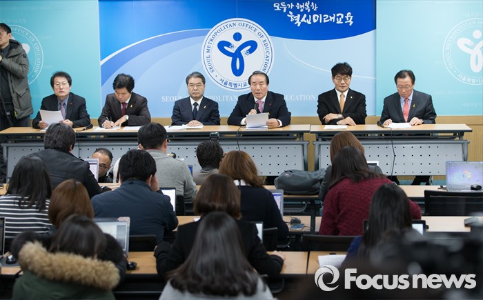 (서울=포커스뉴스) 6일 오후 서울 종로구 서울특별시교육청에서 전국 시도교육감이 정부의 누리과정 예산 미편성 시 강력 대처 발표와 관련해 긴급 기자회견을 하고 있다. 왼쪽부터 조희연 서울시 교육감, 김승환 전라북도 교육감, 이재정 경기도 교육감, 장휘국 광주시 교육감, 이청연 인천시 교육감, 민병희 강원