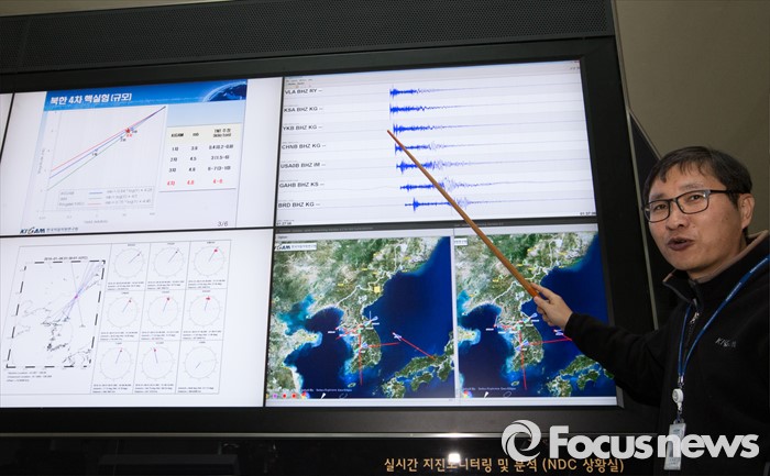 (대전=포커스뉴스) 북한이 수소탄 핵실험을 성공했다고 발표한 가운데 6일 오후 대전 유성구 한국지질자원연구원 지진연구센터에서 신진수 국토지질연구본부장이 북한 수소탄 실험에 대한 조사결과 브리핑을 하고 있다.