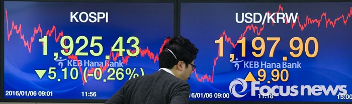 (서울=포커스뉴스) 코스피 지수가 전거래일 보다 5.10포인트(0.26%) 하락한 1,925.43에 거래를 마치며, 북한의 수소탄 실험에도 1920선을 지킨 6일 오후 서울 중구 KEB하나은행 본점 딜링룸에서 딜러들이 업무를 보고 있다. 이날 원달러 환율은 전거래일 보다 9.9원 오른 1197.9원에 마감하며, 지난해 9월 1200.9원 이후 4개월 만에 최고치를 기록 했다.