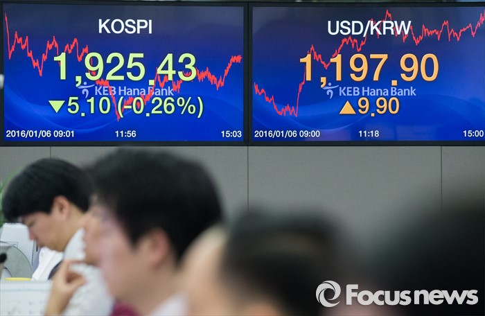(서울=포커스뉴스) 코스피 지수가 전거래일 보다 5.10포인트(0.26%) 하락한 1,925.43에 거래를 마치며, 북한의 수소탄 실험에도 1920선을 지킨 6일 오후 서울 중구 KEB하나은행 본점 딜링룸에서 딜러들이 업무를 보고 있다. 이날 원달러 환율은 전거래일 보다 9.9원 오른 1197.9원에 마감하며, 지난해 9월 1200.9원 이후 4개월 만에 최고치를 기록 했다.
