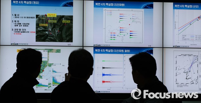 (대전=포커스뉴스) 북한이 수소탄 핵실험을 성공했다고 발표한 가운데 6일 오후 대전 유성구 한국지질자원연구원 지진연구센터에서 관계자들이 수집한 자료를 살피고 있다.