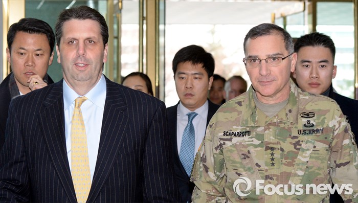 (서울=포커스뉴스) 북한이 첫 수소탄 핵실험을 실시했다고 발표한 6일 오후 서울 종로구 외교부청사에서 마크 리퍼트(왼쪽) 주한 미대사와 커티스 스캐퍼로티 한미연합사령관이 발걸음을 옮기고 있다.
