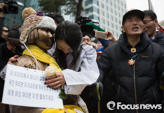 (서울=포커스뉴스) 6일 오후 서울 종로구 위안부 소녀상 앞에서 올해로 24주년을 맞은 일본군 위안부 문제 해결을 위한 1212차 수요 시위가 열렸다. 수요 시위가 끝난 후 어버이연합의 한 회원이 소녀상 앞으로 다가오자 예술인 참석자가 소녀상을 감싸 안고 있다.