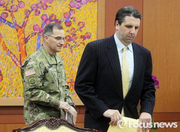 (서울=포커스뉴스) 북한이 첫 수소탄 핵실험을 실시했다고 발표한 6일 오후 서울 종로구 외교부청사에서 마크 리퍼트(오른쪽) 주한 미대사와 커티스 스캐퍼로티 한미연합사령관이 자리로 향하고 있다.