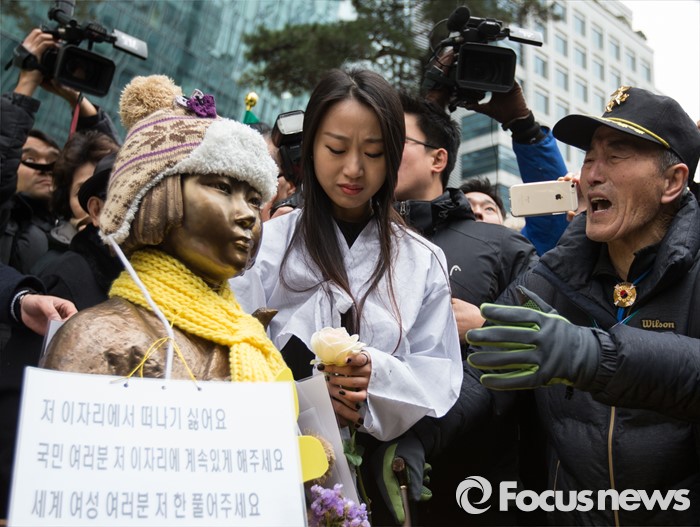 (서울=포커스뉴스) 6일 오후 서울 종로구 위안부 소녀상 앞에서 올해로 24주년을 맞은 일본군 위안부 문제 해결을 위한 1212차 수요 시위가 열렸다. 수요 시위가 끝난 후 어버이연합 회원이 소녀상 앞으로 다가와 울부짖고 있다.
