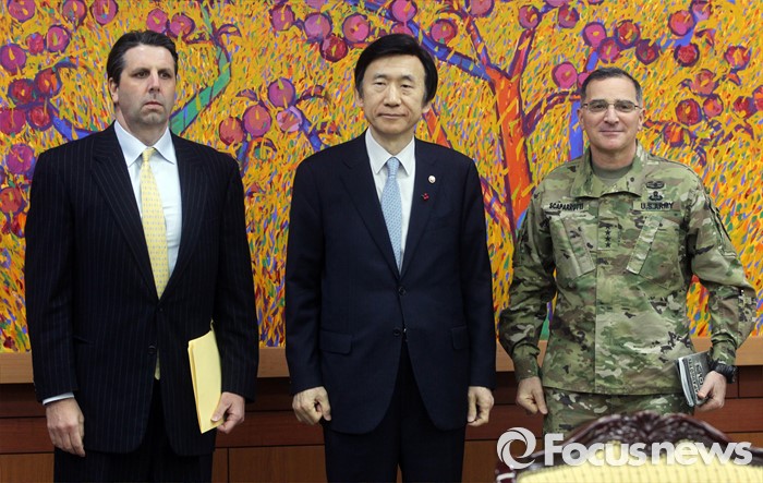 (서울=포커스뉴스) 북한이 첫 수소탄 핵실험을 실시했다고 발표한 6일 오후 서울 종로구 외교부청사에서 마크 리퍼트(왼쪽부터) 주한 미대사와 윤병세 외교부 장관, 커티스 스캐퍼로티 한미연합사령관이 기념촬영하고 있다.