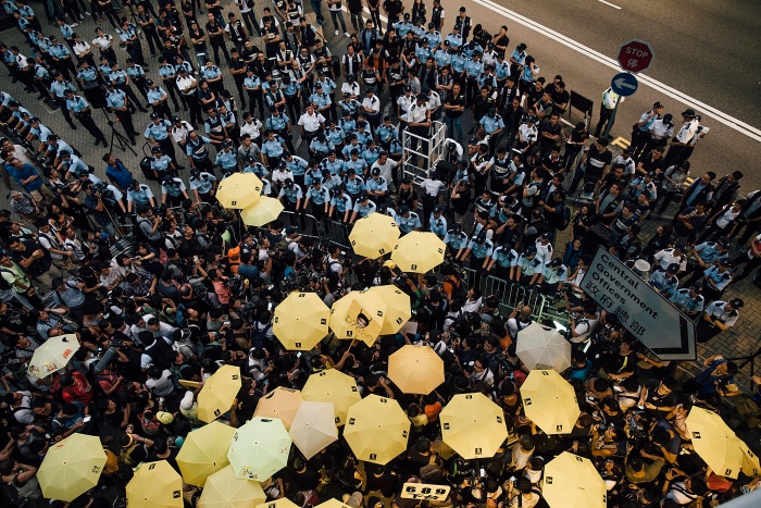 홍콩 민주화 운동가들이 '우산혁명' 1주년을 맞아 2015년 9월 28일 홍콩 도심에서 시위하고 있다. '우산혁명'은 2017년의 홍콩 행정장관 선출을 완전한 직선제로 하자고 요구한 민주화 운동이다.(Photo by Anthony Kwan/Getty Images)
