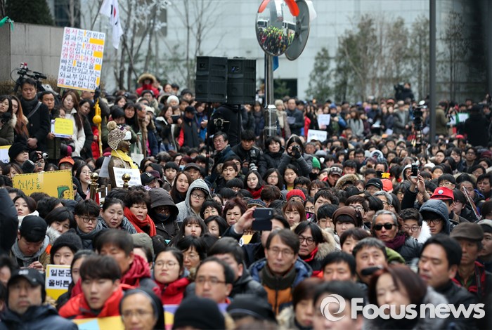 (서울=포커스뉴스) 일본군 위안부 문제 해결을 위한 정기 수요집회 24주년인 6일 오후 서울 종로구 주한일본대사관 앞에서 제1212차 수요집회가 열리고 있다.