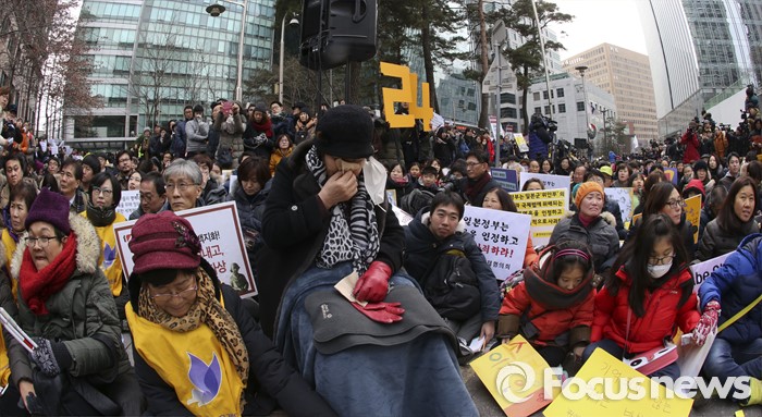 (서울=포커스뉴스) 6일 서울 종로구 옛 일본대사관 앞에서 열린 제1212차 정기수요집회에서 이용수 할머니와 참석자들이 자리하고 있다. 단일 주제로 벌이는 세계 최장기 집회로 알려진 정기수요집회는 1992년 1월 8일 시작해 금일로 24주년을 맞이했다.