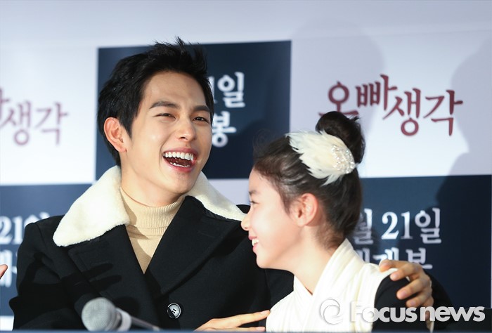 (서울=포커스뉴스) 6일 오후 서울 광진구 롯데시네마 건대입구점에서 열린 영화 '오빠생각' 언론시사회에 참석한 배우 임시완(왼쪽)과 이레가 환한 미소를 짓고 있다.