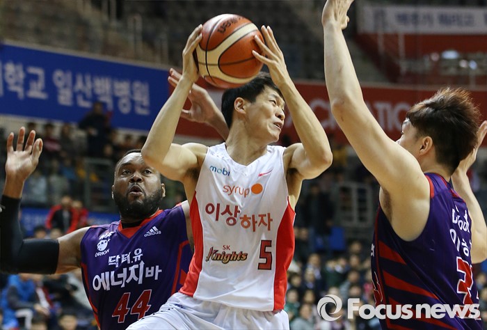 (고양=포커스뉴스) 6일 고양체육관에서 열린 2015-2016 프로농구 오리온-SK 경기에서 SK 김선형이 오리온 존슨과 이승현의 마크를 피해 패스를 시도하고 있다.