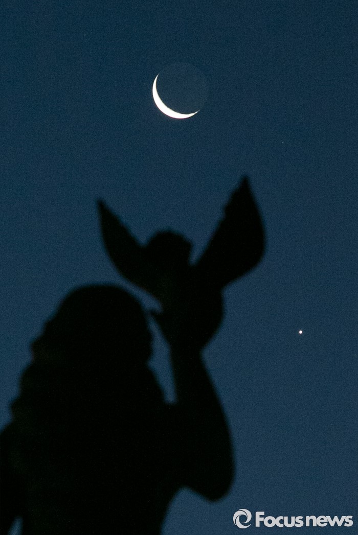 (서울=포커스뉴스) 7일 오전 서울 여의도 국회 평화와 번영의 상 하늘 위로 그믐달과 샛별이 밝게 빛나고 있다.