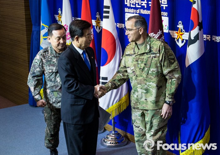 (서울=포커스뉴스) 한민구 국방부 장관과 커티스 스캐퍼로티 주한미군사령관이 7일 오전 서울 용산구 국방부에서 북한 수소탄 실험에 대한 한미 양국 공조 방안을 발표한 뒤 악수 하고 있다.