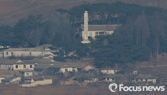 (파주=포커스뉴스) 7일 오전 경기도 파주 오두산 통일전망대에서 북한 황해북도 개풍군 김일성 사적관(가운데)이 관측되고 있다.