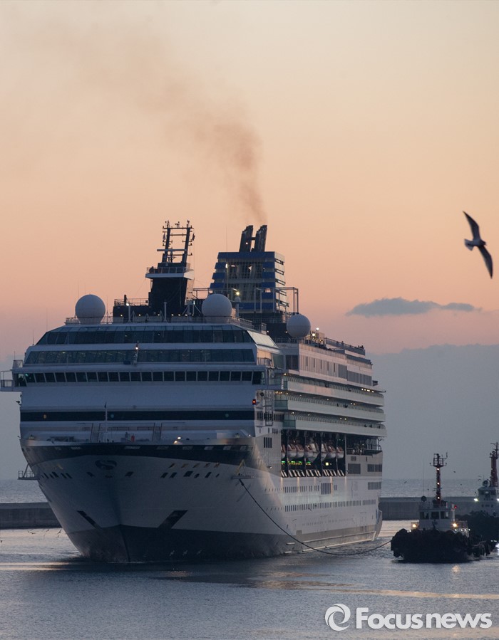 (동해=포커스뉴스) 7일 오전 강원 동해항 중앙부두에 중국 천해크루즈사의 스카이씨 골든 에라호가 승객 1천800여 명을 싣고 입항하고 있다. 이날 강원도를 찾은 관광객 1천800여 명은 정선 강원랜드 눈썰매장, 평창 용평·알펜시아스키장, 속초 중앙시장, 설악산 등을 둘러볼 예정이다.