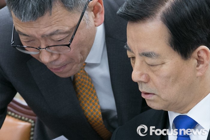 (서울=포커스뉴스) 한민구(오른쪽) 국방부 장관과 류제승 국방정책실장이 7일 오전 서울 여의도 국회에서 북한의 수소탄 핵실험과 관련해 열린 국방위원회 전체회의에 출석해 현안보고 전, 논의하고 있다.