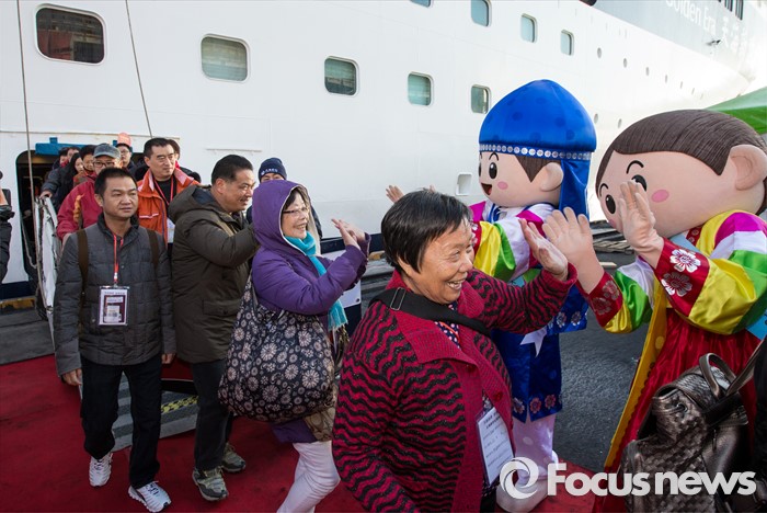 (동해=포커스뉴스) 7일 오전 강원 동해항 중앙부두에 입항한 중국 천해크루즈사의 스카이씨 골든 에라호에서 중국인 관광객들이 하선하고 있다. 이날 강원도를 찾은 관광객 1천800여 명은 정선 강원랜드 눈썰매장, 평창 용평·알펜시아스키장, 속초 중앙시장, 설악산 등을 둘러볼 예정이다.