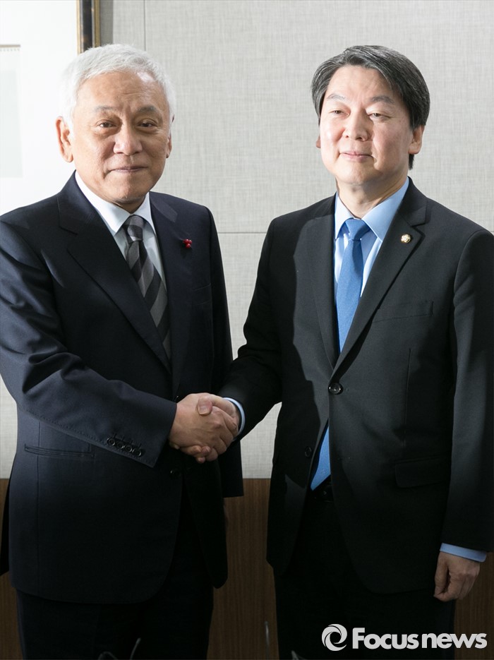 (서울=포커스뉴스) 더불어민주당을 탈당한 김한길(왼쪽), 안철수 의원이 7일 오후 서울 여의도 국회 의원회관 의원식당에서 오찬 회동을 위해 만나, 악수하고 있다.