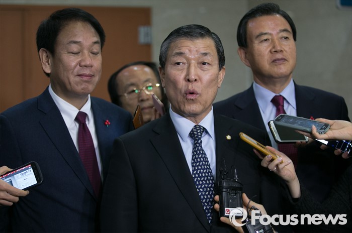 (서울=포커스뉴스) 황진하 새누리당 공천제도특별위원장이 7일 오전 서울 여의도 국회 정론관에서 특위 회의 결과에 대한 브리핑을 마친 뒤 취재진 질문에 답하고 있다. 왼쪽부터 박종희 제2사무부총장, 황 위원장, 홍문표 의원.