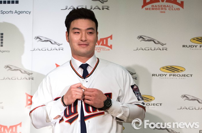 (서울=포커스뉴스) 미네소타 트윈스에 입단한 박병호가 7일 오전 서울 서대문구 그랜드힐튼호텔에서 기자회견을 열고 메이저리그 진출에 대한 소감과 포부를 밝힌 뒤 미네소타 트윈즈 유니폼을 입고 포즈를 취하고 있다.