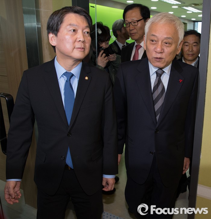 (서울=포커스뉴스) 야권 신당을 추진 중인 안철수, 김한길 무소속 의원이 7일 오후 서울 마포구 신당 당사에서 국민공감포럼 신당 참여 기자회견과 북한 핵실험 관련 성명 발표를 마친 뒤 대화를 나누고 있다.