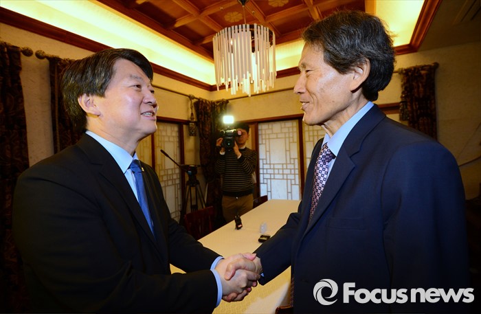(서울=포커스뉴스) 더불어민주당 탈당 후 신당 창당을 준비하고 있는 안철수 무소속 의원이 7일 오후 서울 종로구 경운동 민다가헌에서 한상진 교수와 만나 악수를 나누고 있다.