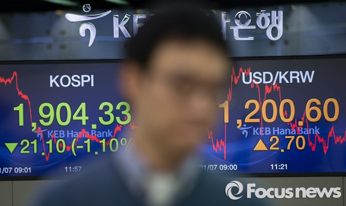 (서울=포커스뉴스) 중국 증시가 7일 또다시 폭락했다. 7일 오후 서울 중구 KEB하나은행 딜링룸에서 직원들이 분주히 움직이고 있는 가운데 코스피지수는 21.10포인트 떨어진 1904.33으로 하락,원 달러 환율은 4개월여만에 1200원을 돌파한 1200.60으로 마감했다.