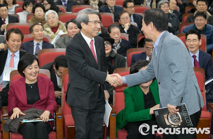 (서울=포커스뉴스) 7일 오후 서울 여의도 국회 의원회관에서 동반성장연구소 주최로 열린 '동반성장과 경제민주화, 잘 되고 있는가?' 포럼에 참석한 김성태(오른쪽) 새누리당 의원과 정운찬 전 총리가 인사하고 있다.