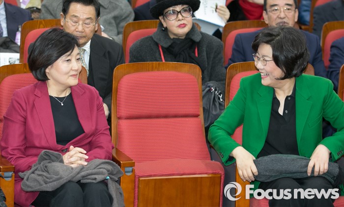 (서울=포커스뉴스) 7일 오후 서울 여의도 국회 의원회관에서 동반성장연구소 주최로 열린 '동반성장과 경제민주화, 잘 되고 있는가?' 포럼에 참석한 이혜훈(오른쪽) 전 새누리당 의원과 박영선 더불어민주당 의원이 대화하고 있다.