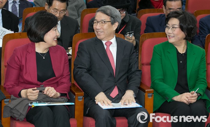 (서울=포커스뉴스) 7일 오후 서울 여의도 국회 의원회관에서 동반성장연구소 주최로 열린 '동반성장과 경제민주화, 잘 되고 있는가?' 포럼에 참석한 이혜훈(오른쪽부터) 전 새누리당 의원, 정운찬 전 총리, 박영선 더불어민주당 의원이 대화하고 있다.