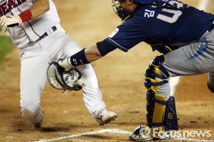 '공식 야구규칙 7.13 홈플레이트에서의 충돌' 'KBO 리그 규정 제28조 심판합의판정' 등 개정 사항은 2016시즌 시범경기에서부터 적용된다.<서울=포커스뉴스> 한국야구위원회 규칙위원회는 홈충돌 방지 규정을 신설하고, 심판합의판정 규정도 일부 변경했다. 사진은 지난해 8월13일 열린 두산과 NC와의 경기에서 NC 포수 김태군이 주자 허경민을 홈에서 태그아웃하고 있는 모습. 우정식 기자