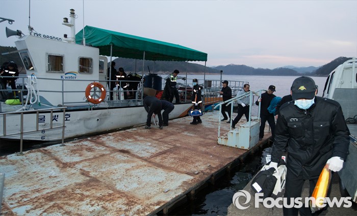 (대전=포커스뉴스) 7일 오후 1시 53분께 대전 대덕구 대청호 일원에서 대전 동구청 유해조수방지단 보트가 침몰해 2명이 구조되고 2명이 실종된 가운데 대전·충북소방본부 119구조대가 날이 어두워지자 실종자 수색 작업을 중단하고 돌아오고 있다.
