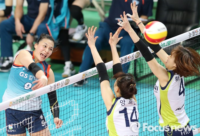 (서울=포커스뉴스) 7일 장충체육관에서 열린 '2015-2016NH농협 V-리그' 여자부 GS칼텍스-현대건설 경기에서 GS칼텍스 표승주가 현대건설 황연주, 양효진의 블로킹 위로 강스파이크를 터뜨리고 있다.
