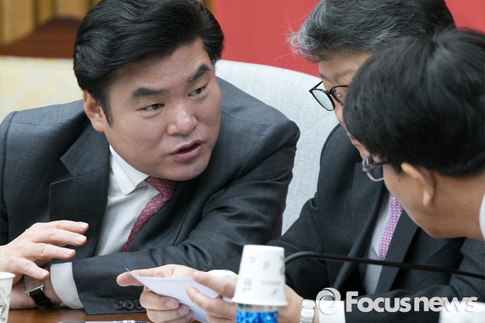 (서울=포커스뉴스) 새누리당 원유철(왼쪽부터) 원내대표와 조원진 원내수석부대표, 권성동 의원이 8일 오전 서울 여의도 국회에서 열린 원내대책회의에 참석해 논의하고 있다.