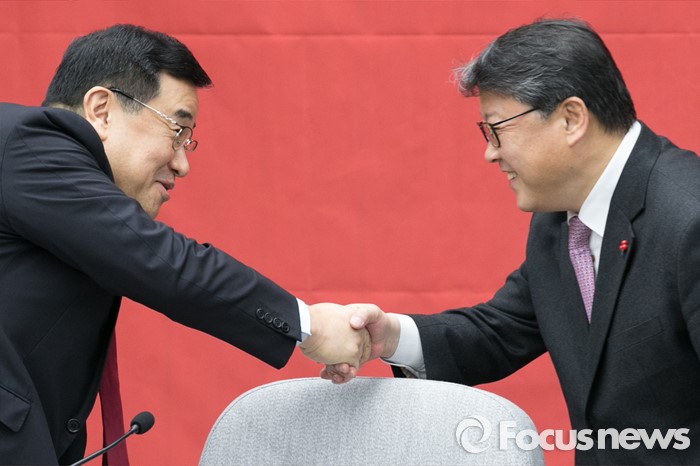 | △ 악수하는 김정훈·조원진 |