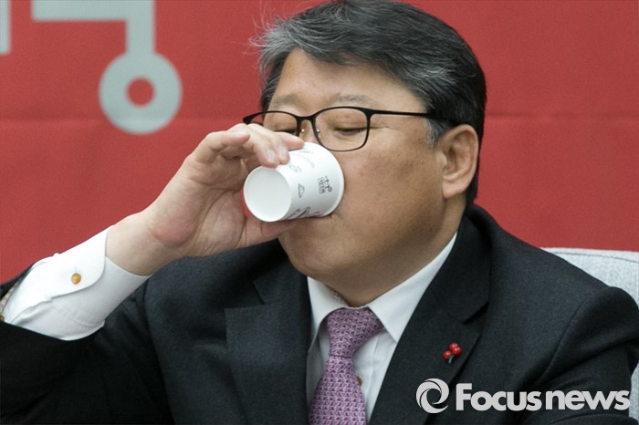 (서울=포커스뉴스) 조원진 새누리당 원내수석부대표가 8일 오전 서울 여의도 국회에서 열린 원내대책회의에 참석해 물을 마시고 있다.