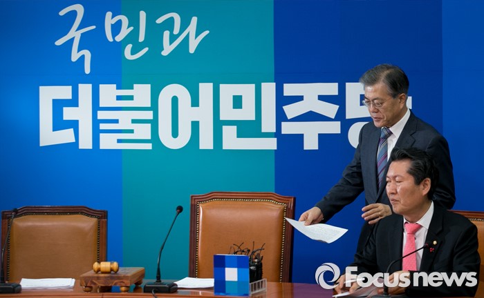 (서울=포커스뉴스) 문재인(왼쪽) 더불어민주당 대표과 정청래 최고위원이 8일 오전 서울 여의도 국회에서 열린 최고위원회의에 참석하고 있다.