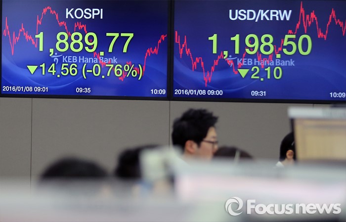(서울=포커스뉴스) 남북 긴장고조와 중국발 악재 영향으로 코스피 지수 1900선이 무너진 8일 오전 서울 중구 KEB하나은행 딜링룸에서 직원들이 업무에 열중하고 있다.
