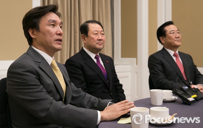 (서울=포커스뉴스) 더불어민주당을 탈당해 신당을 추진 중인 김민석(왼쪽부터) 전 의원, 박주선 의원, 박준영 전 전남지사가 8일 오전 서울 여의도 국회 귀빈식당에서 신당 통합 논의를 위해 만나 취재진에게 설명하고 있다.