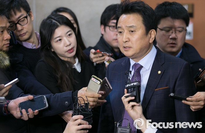 | △ 탈당 후 취재진 질문 답하는 김영환 |