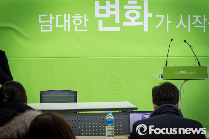 (서울=포커스뉴스) 8일 오전 서울 마포구 안철수 무소속 의원 당사에서 예정된 윤여준 전 환경부 장관의 신당 창당준비위원장직 수락 기자회견이 윤 전 장관의 건강 문제로 취소됐다. 이날 기자회견장의 윤 전 장관 자리가 비어있다.