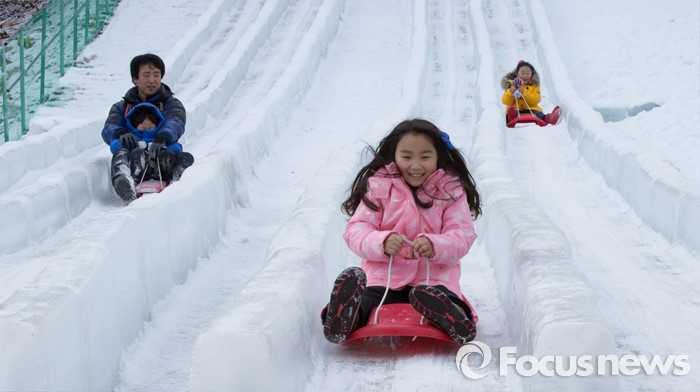 (청양=포커스뉴스) 8일 오전 충남 청양군 정산면 알프스마을에서 열린 칠갑산 얼음분수축제를 방문한 어린이들이 얼음썰매를 타며 즐거운 시간을 보내고 있다.