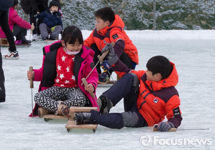 (청양=포커스뉴스) 8일 오전 충남 청양군 정산면 알프스마을에서 열린 칠갑산 얼음분수축제를 방문한 어린이들이 썰매를 타며 즐거운 시간을 보내고 있다.