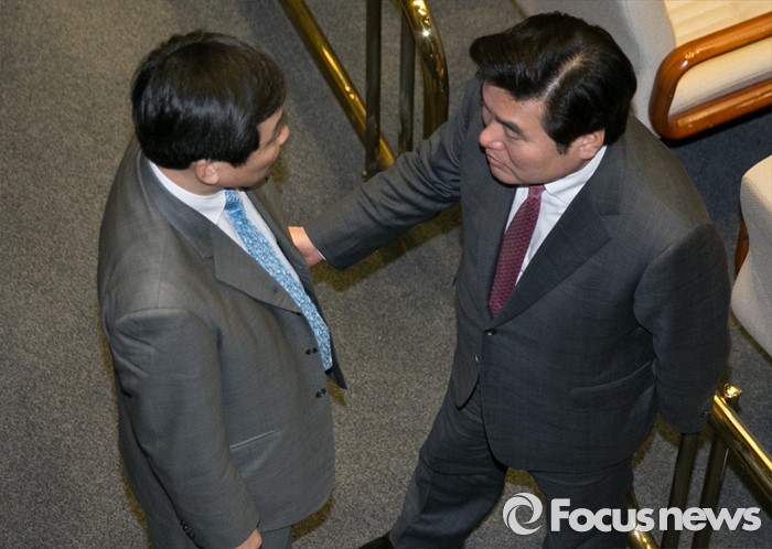(서울=포커스뉴스) 8일 오후 서울 여의도 국회에서 열린 338회 국회(임시회) 3차 본회의에 참석한 원유철(오른쪽) 새누리당 원내대표와 이종걸 더불어민주당 원내대표가 대화하고 있다.