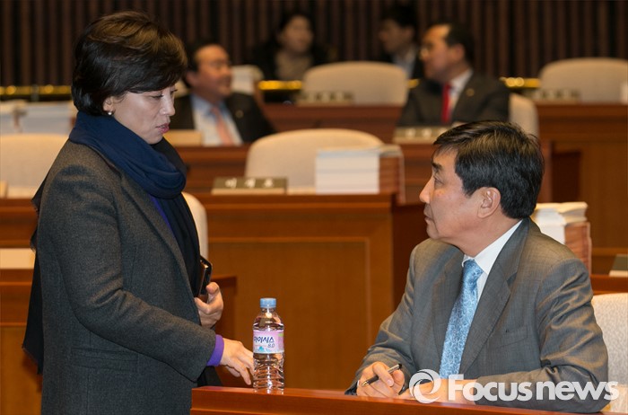 (서울=포커스뉴스) 이종걸(오른쪽) 더불어민주당 원내대표와 남인순 여성가족위원회 야당 간사가 8일 오후 서울 여의도 국회에서 열린 의원총회에 참석해 대화하고 있다.