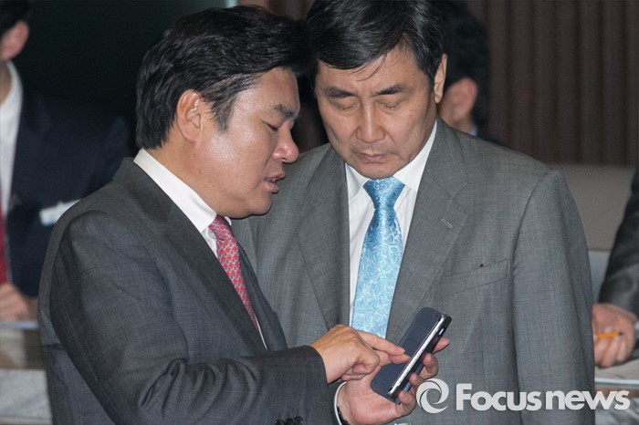 (서울=포커스뉴스) 원유철(왼쪽) 새누리당 원내대표와 이종걸 더불어민주당 원내대표가 8일 오후 서울 여의도 국회 본회의장에서 논의하고 있다.